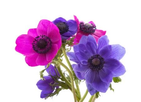 Anemones resemble poppy flowers with large, delicate leaves surrounding a round black center. The effect is striking, which makes this bloom popular amongst brides, florists, and wedding planners. You can find anemones in brilliant shades of purple, blue, pink, red, and white.